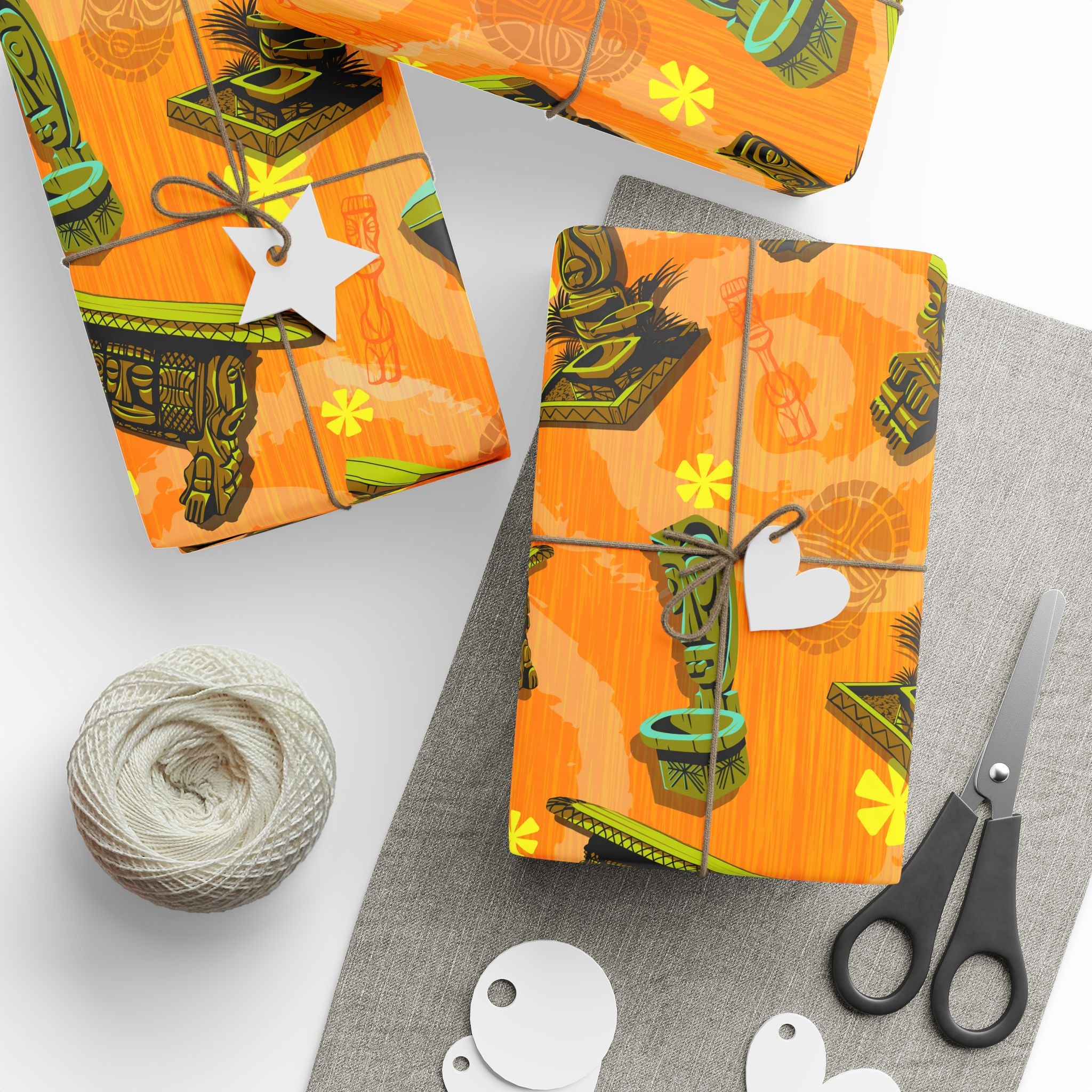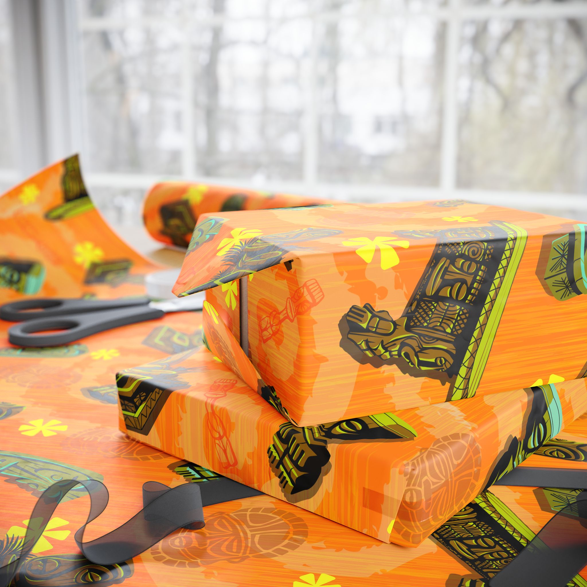 ORANGE Tiki Wrapping Paper — "Enchanted Carvings" Tiki Gift Wrap